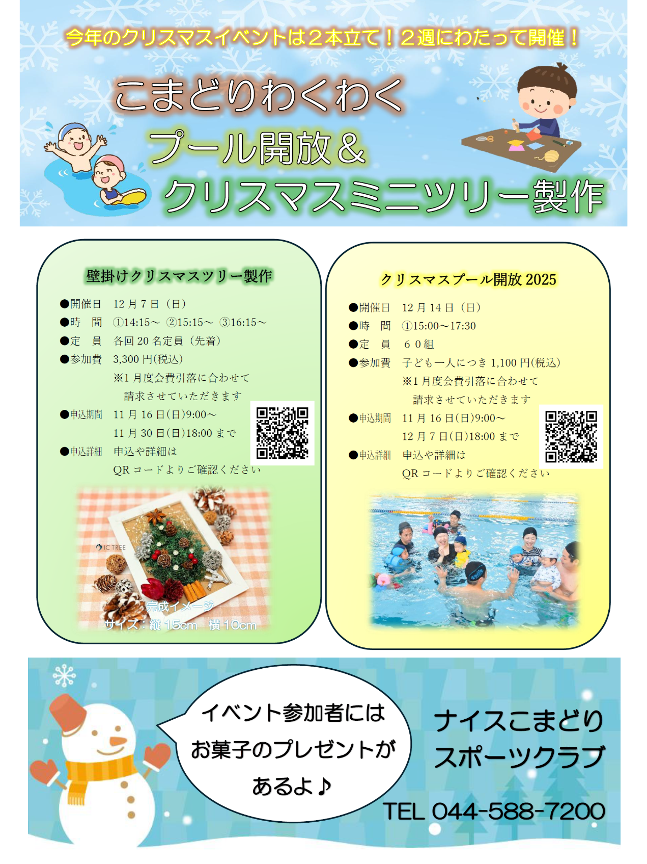 2週にわたって開催!クリスマスイベント2025 クリスマスイベント2025-11-01 00:00 ●ワークショップの詳細やお申し込みの方はこちらをクリック●プール開放水遊びフェスタの詳細やお申し込みの方はこちらをクリック