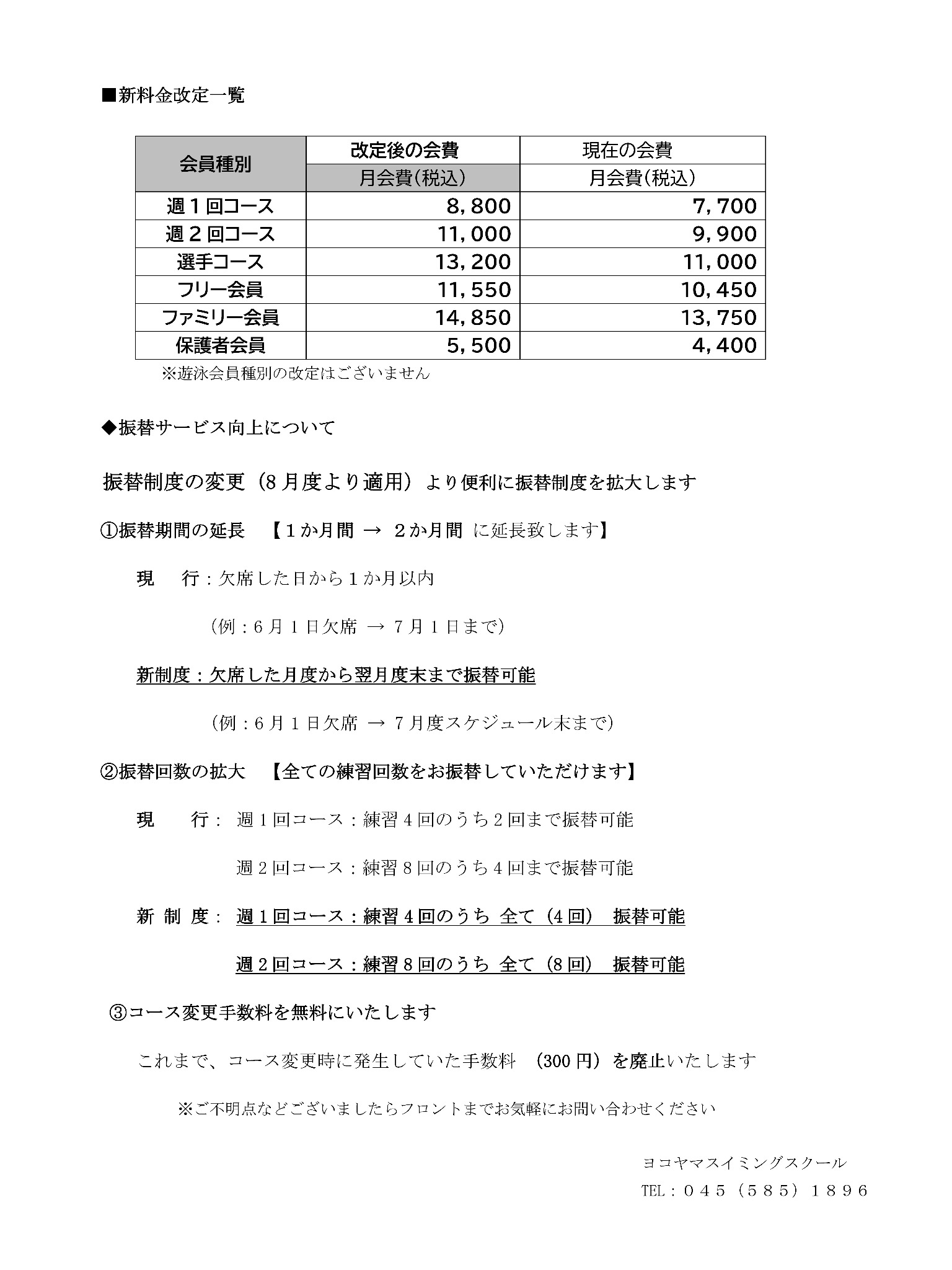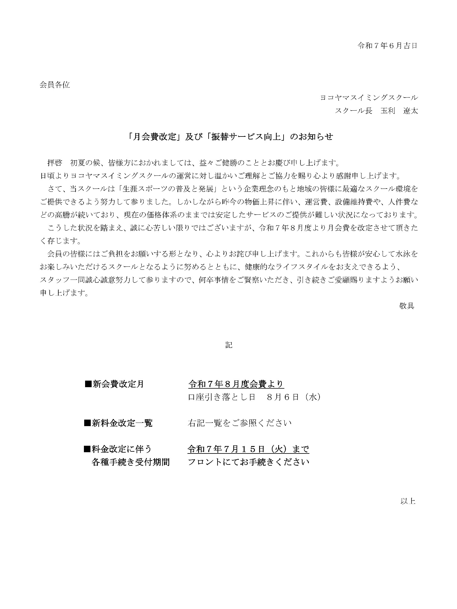 令和7年8月「月会費改定」及び「振替サービス向上」のお知らせ 重要2025-06-12 09:00 ※予定されておりました7月度・8月度の特別振替月間につきましては、振替期限を欠席した月度から翌々月末までとさせていただきます。※今年度の9月以降の特別振替月間は廃止させていただきます。